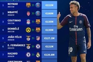 1、内马尔,2017-18赛季巴萨→巴黎,2.22亿欧元