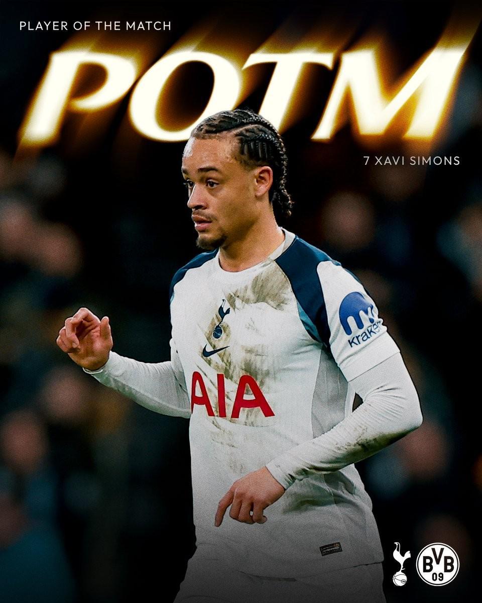 热刺官方宣布,哈维-西蒙斯当选球队与多特蒙德一役队内最佳球员。